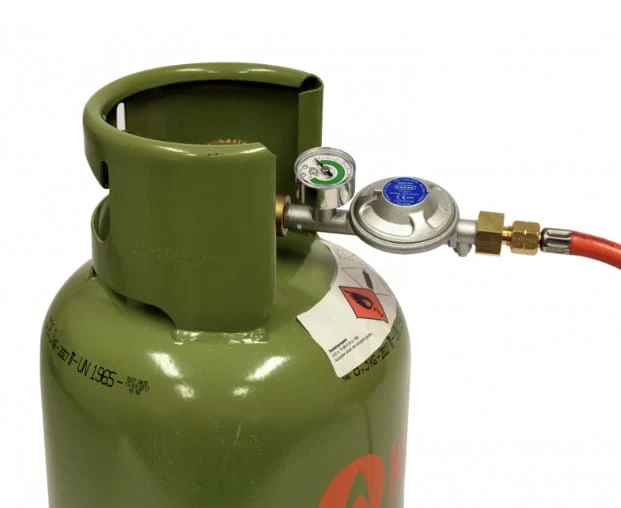 Ten uniwersalny reduktor ciśnienia umożliwia podłączenie urządzenia niskociśnieniowego do uniwersalnej, nadającej się do ponownego napełnienia butli gazowej. Regulator przelewowy automatycznie odcina dopływ gazu w przypadku uszkodzenia lub nieszczelności węża gazowego.